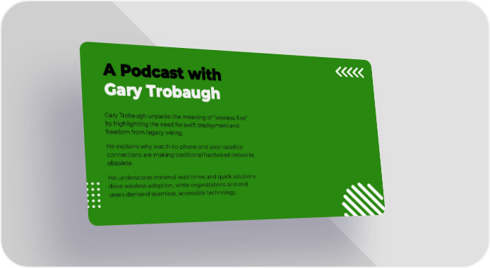 EPISODE: A Podcast with Gary Trobaugh Gary Trobaugh unpacks the meaning of “wireless first” by highlighting the need for swift deployment and freedom from legacy wiring. He explains why watch-to-phone and soon satellite connections are making traditional hardwired networks obsolete. He underscores minimal wait times and quick solutions drive wireless adoption, while organizations and end users demand seamless, accessible technology.
