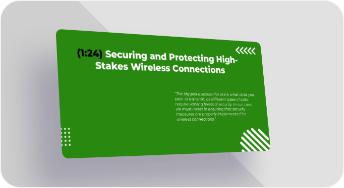 (1:24) Securing and Protecting High- Stakes Wireless Connections βThe biggest question for me is what data you plan to transmit, as different types of data require varying levels of security. In our case, we must invest in ensuring that security measures are properly implemented for wireless connections.β