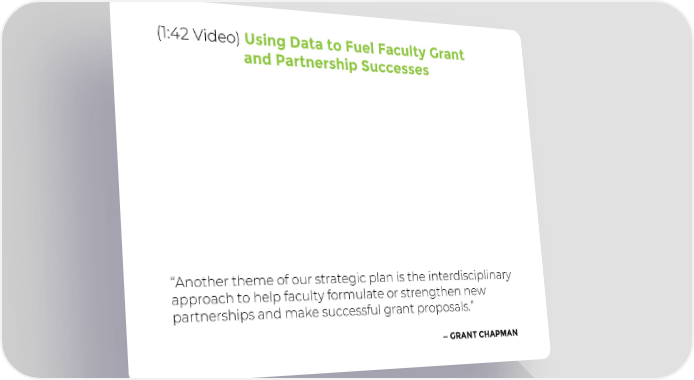 (1:42 Video) Using Data to Fuel Faculty Grant and Partnership Successes “Another theme of our strategic plan is the interdisciplinary approach to help faculty formulate or strengthen new partnerships and make successful grant proposals.” —GRANT CHAPMAN