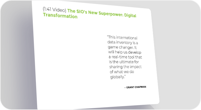 (1:41 Video) The SIO's New Superpower: Digital Transformation “This international data inventory is a game changer. It will help us develop a real-time tool that is the ultimate for sharing the impact of what we do globally.” —GRANT CHAPMAN