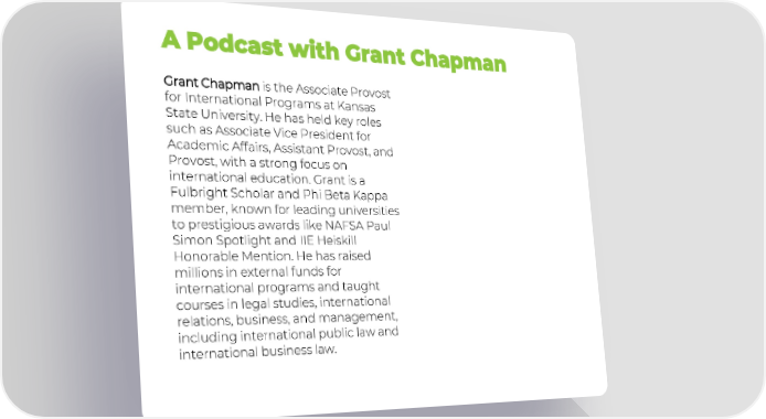 A Podcast with Grant Chapman Grant Chapman is the Associate Provost for International Programs at Kansas State University. He has held key roles such as Associate Vice President for Academic Affairs, Assistant Provost, and Provost, with a strong focus on international education. Grant is a Fulbright Scholar and Phi Beta Kappa member, known for leading universities to prestigious awards like NAFSA Paul Simon Spotlight and IIE Heiskill Honorable Mention. He has raised millions in external funds for international programs and taught courses in legal studies, international relations, business, and management, including international public law and international business law.