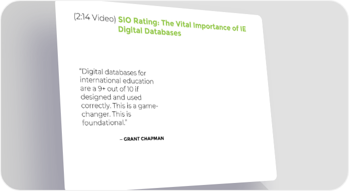 (2:14 Video) SIO Rating: The Vital Importance of IE Digital Databases “Digital databases for international education are a 9+ out of 10 if designed and used correctly. This is a game- changer. This is foundational.” —GRANT CHAPMAN