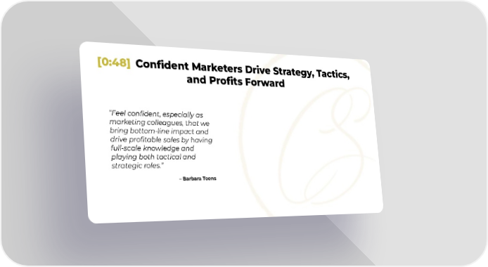 [0:48] Confident Marketers Drive Strategy, Tactics, and Profits Forward “Feel confident, especially as marketing colleagues, that we bring bottom-line impact and drive profitable sales by having full-scale knowledge and playing both tactical and strategic roles.” – Barbara Toens