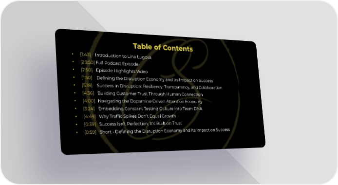 Table of Contents • [1:43] Introduction to Lina Lugova • [28:50] Full Podcast Episode • [2:50] Episode Highlights Video • [1:50] Defining the Disruption Economy and Its Impact on Success • [5:18] Success in Disruption: Resiliency, Transparency, and Collaboration • [4:36] Building Customer Trust Through Human Connection • [4:00] Navigating the Dopamine‑Driven Attention Economy • [3:24] Embedding Constant Testing Culture into Team DNA • [4:49] Why Traffic Spikes Don’t Equal Growth • [0:39] Success Isn’t Perfection, It’s Built on Trust • [0:59] Short - Defining the Disruption Economy and Its Impact on Success