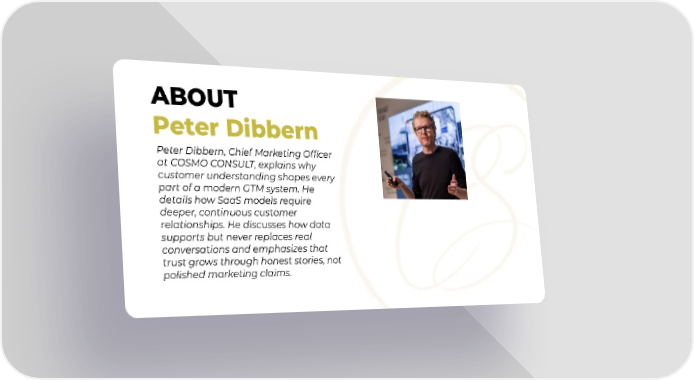 ABOUT Peter Dibbern Peter Dibbern, Chief Marketing Officer at COSMO CONSULT, explains why customer understanding shapes every part of a modern GTM system. He details how SaaS models require deeper, continuous customer relationships. He discusses how data supports but never replaces real conversations and emphasizes that trust grows through honest stories, not polished marketing claims.