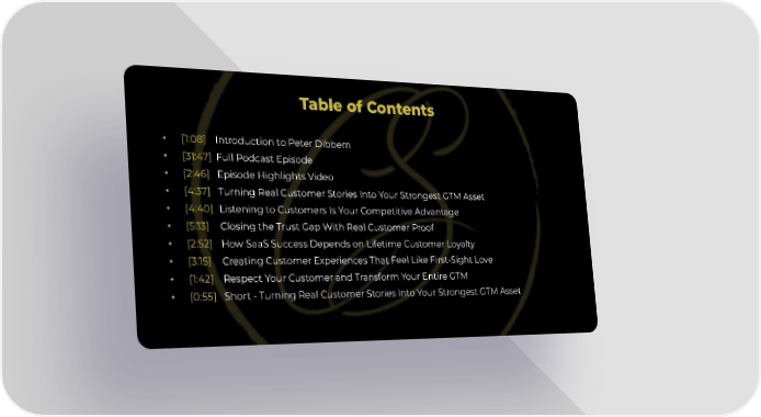 Table of Contents [1:08] Introduction to Peter Dibbern [31:47] Full Podcast Episode [2:46] Episode Highlights Video [4:37] Turning Real Customer Stories Into Your Strongest GTM Asset [4:40] Listening to Customers Is Your Competitive Advantage [5:13] Closing the Trust Gap With Real Customer Proof [2:52] How SaaS Success Depends on Lifetime Customer Loyalty [3:15] Creating Customer Experiences That Feel Like First-Sight Love [1:42] Respect Your Customer and Transform Your Entire GTM [0:55] Short - Turning Real Customer Stories Into Your Strongest GTM Asset