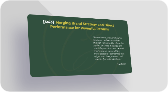 [4:43] Merging Brand Strategy and Direct Performance for Powerful Returns "As marketers, we work hard to reach our audiences and cut through the noise. But often, the perfect business message isn’t what they want to hear. Instead, they’re drawn to something more personal—something that aligns with their passions and what truly matters to them." – Ryan Nelsen