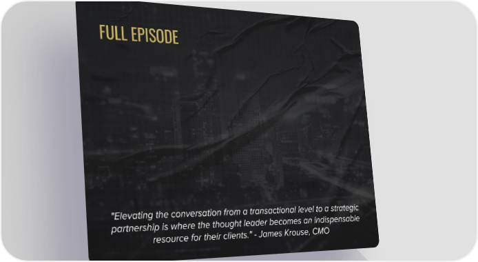 FULL EPISODE "Elevating the conversation from a transactional level to a strategic partnership is where the thought leader becomes an indispensable resource for their clients." - James Krouse, CMO How to Reframe the B2B Buyer Conversation for Success Page 3 Page 5Video Player is loading.Play VideoPlaySkip BackwardSkip ForwardMuteCurrent Time 0:00/Duration 31:03Loaded: 0.00%00:00Stream Type LIVESeek to live, currently behind liveLIVERemaining Time -31:03 1xPlayback RateChaptersChaptersDescriptionsdescriptions off, selectedCaptionscaptions settings, opens captions settings dialogcaptions off, selectedAudio TrackPicture-in-PictureFullscreenThis is a modal window.Beginning of dialog window. Escape will cancel and close the window.TextColorWhiteBlackRedGreenBlueYellowMagentaCyanOpacityOpaqueSemi-TransparentText BackgroundColorBlackWhiteRedGreenBlueYellowMagentaCyanOpacityOpaqueSemi-TransparentTransparentCaption Area BackgroundColorBlackWhiteRedGreenBlueYellowMagentaCyanOpacityTransparentSemi-TransparentOpaqueFont Size50%75%100%125%150%175%200%300%400%Text Edge StyleNoneRaisedDepressedUniformDrop shadowFont FamilyProportional Sans-SerifMonospace Sans-SerifProportional SerifMonospace SerifCasualScriptSmall CapsResetDoneClose Modal DialogEnd of dialog window.videovideo