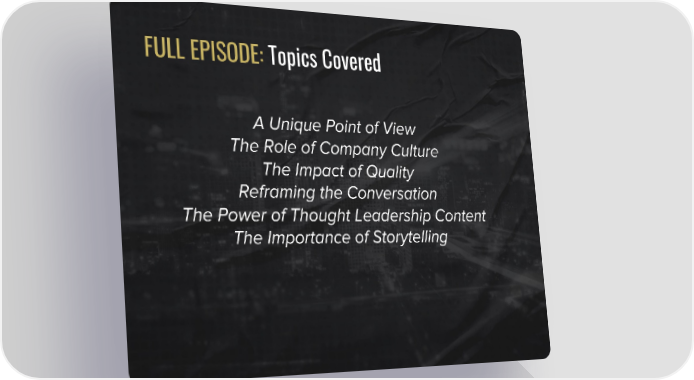 FULL EPISODE: Topics Covered A Unique Point of View The Role of Company Culture The Impact of Quality Reframing the Conversation The Power of Thought Leadership Content The Importance of Storytelling