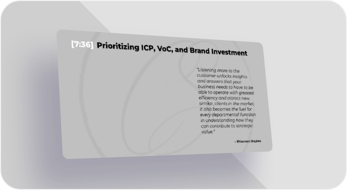[7:36] Prioritizing ICP, VoC, and Brand Investment “Listening more to the customer unlocks insights and answers that your business needs to have to be able to operate with greatest efficiency and attract new, similar, clients in the market. It also becomes the fuel for every departmental function in understanding how they can contribute to strategic value.” – Rhiannon Staples
