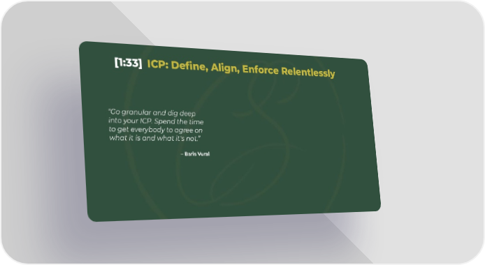[1:33] ICP: Define, Align, Enforce Relentlessly “Go granular and dig deep into your ICP. Spend the time to get everybody to agree on what it is and what it's not.” – Baris Vural