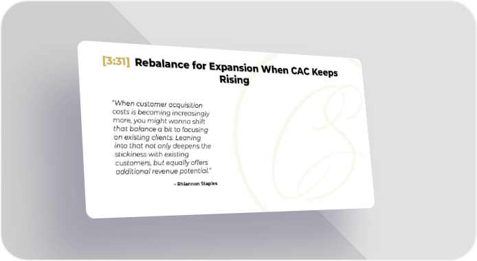 [3:31] Rebalance for Expansion When CAC Keeps Rising “When customer acquisition costs is becoming increasingly more, you might wanna shift that balance a bit to focusing on existing clients. Leaning into that not only deepens the stickiness with existing customers, but equally offers additional revenue potential.” – Rhiannon Staples