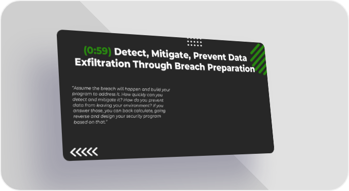 11 (0:59) Detect, Mitigate, Prevent Data Exfiltration Through Breach Preparation “Assume the breach will happen and build your program to address it. How quickly can you detect and mitigate it? How do you prevent data from leaving your environment? If you answer those, you can back calculate, going reverse and design your security program based on that.”