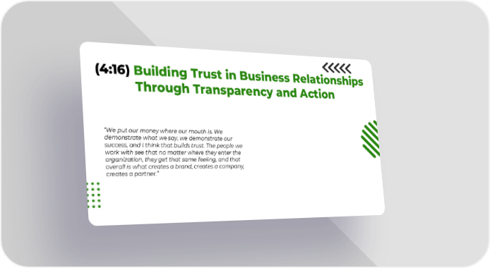 (4:16) Building Trust in Business Relationships Through Transparency and Action “We put our money where our mouth is. We demonstrate what we say, we demonstrate our success, and I think that builds trust. The people we work with see that no matter where they enter the organization, they get that same feeling, and that overall is what creates a brand, creates a company, creates a partner.”