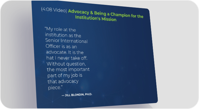(4:08 Video) Advocacy & Being a Champion for the Institution's Mission “My role at the institution as the Senior International Officer is as an advocate. It is the hat I never take off. Without question, the most important part of my job is that advocacy piece.” —JILL BLONDIN, PH.D.