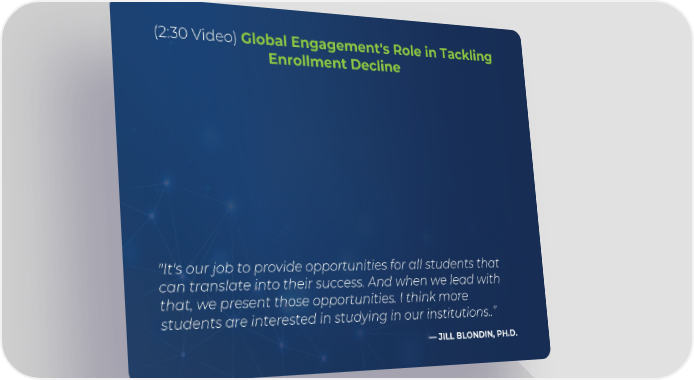 (2:30 Video) Global Engagement's Role in Tackling Enrollment Decline "It's our job to provide opportunities for all students that can translate into their success. And when we lead with that, we present those opportunities. I think more students are interested in studying in our institutions..” —JILL BLONDIN, PH.D.