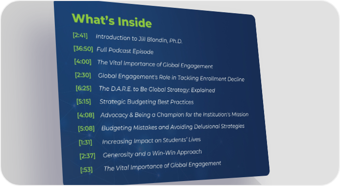 What’s Inside [2:41] Introduction to Jill Blondin, Ph.D. [36:50] Full Podcast Episode [4:00] The Vital Importance of Global Engagement [2:30] Global Engagement's Role in Tackling Enrollment Decline [6:25] The D.A.R.E. to Be Global Strategy: Explained [5:15] Strategic Budgeting Best Practices [4:08] Advocacy & Being a Champion for the Institution's Mission [5:08] Budgeting Mistakes and Avoiding Delusional Strategies [1:31] Increasing Impact on Students’ Lives [2:37] Generosity and a Win-Win Approach [:53] The Vital Importance of Global Engagement