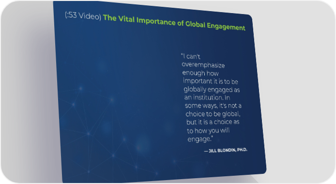 (:53 Video) The Vital Importance of Global Engagement “I can't overemphasize enough how important it is to be globally engaged as an institution. In some ways, it's not a choice to be global, but it is a choice as to how you will engage.” —JILL BLONDIN, PH.D.