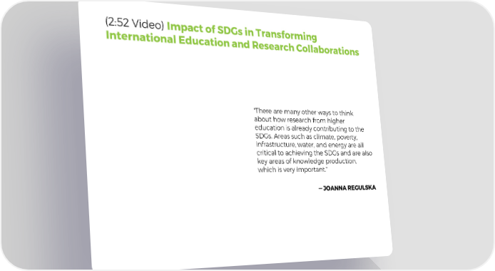 (2:52 Video) Impact of SDGs in Transforming International Education and Research Collaborations "There are many other ways to think about how research from higher education is already contributing to the SDGs. Areas such as climate, poverty, infrastructure, water, and energy are all critical to achieving the SDGs and are also key areas of knowledge production, which is very important." —JOANNA REGULSKA