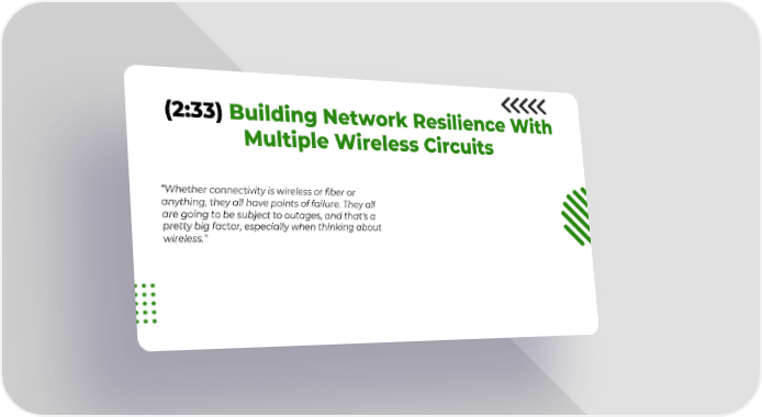 (2:36) Build Resilience With Multiple Wireless Circuits Whether connectivity is wireless or fiber or anything, they all have points of failure. They all are going to be subject to outages, and that's a pretty big factor, especially when thinking about wireless.