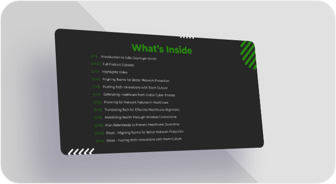 What’s Inside [2:11] Introduction to Julie Dearinger-Smith [28:02] Full Podcast Episode [2:10] Highlights Video [5:43] Aligning Teams for Better Network Protection [1:30] Fueling Tech Innovations with Team Culture [4:31] Defending Healthcare from Global Cyber Threats [2:02] Planning for Network Failures in Healthcare [3:45] Translating Tech for Effective Healthcare Alignment [3:01] Mobilizing Health Through Wireless Connections [2:08] Plan Relentlessly to Prevent Healthcare Downtime [0:50] Short - Aligning Teams for Better Network Protection [0:54] Short - Fueling Tech Innovations with Team Culture