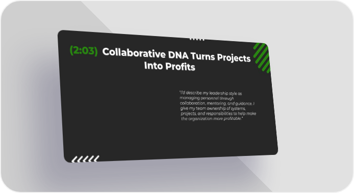 8 (2:03) Collaborative DNA Turns Projects Into Profits “I’d describe my leadership style as managing personnel through collaboration, mentoring, and guidance. I give my team ownership of systems, projects, and responsibilities to help make the organization more profitable.”
