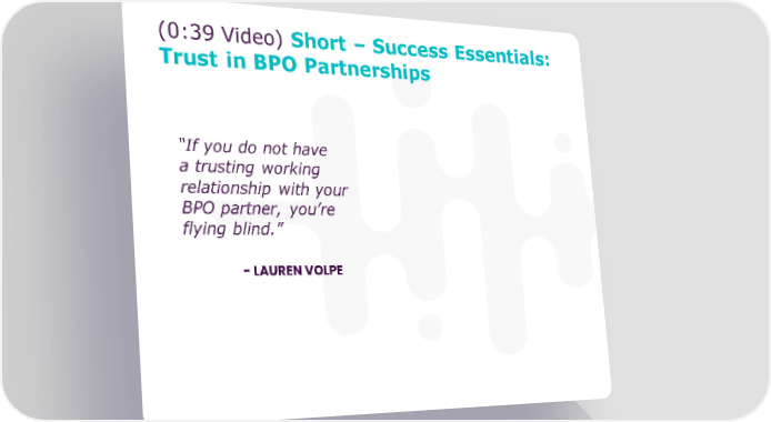 (0:39 Video) Short – Success Essentials: Trust in BPO Partnerships “If you do not have a trusting working relationship with your BPO partner, you’re flying blind.” -LAUREN VOLPE