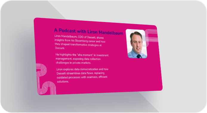 A Podcast with Liron Mandelbaum Liron Mandelbaum, COO of Dasseti, shares insights from his Bloomberg career and how they shaped transformative strategies at Dasseti. He highlights the “aha moment” in investment management, exposing data collection challenges in private markets. Liron explores data democratization and how Dasseti streamlines data flows, replacing outdated processes with seamless, efficient solutions.