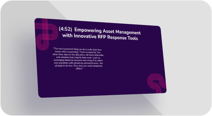 (4:52) Empowering Asset Management with Innovative RFP Response Tools "The most powerful thing we do is make their lives easier when responding. That’s included for free when they reply to the allocators. All these little bells and whistles that simplify their work—such as leveraging historical answers and using AI to match new questions with previously answered ones—are all built in for free. Plus, they can work completely offline."