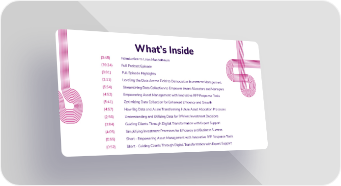 What’s Inside (3:48) Introduction to Liron Mandelbaum (39:24) Full Podcast Episode (3:01) Full Episode Highlights (2:11) Leveling the Data Access Field to Democratize Investment Management (5:54) Streamlining Data Collection to Empower Asset Allocators and Managers (4:52) Empowering Asset Management with Innovative RFP Response Tools (5:41) Optimizing Data Collection for Enhanced Efficiency and Growth (4:57) How Big Data and AI are Transforming Future Asset Allocation Processes (2:56) Understanding and Utilizing Data for Efficient Investment Decisions (3:04) Guiding Clients Through Digital Transformation with Expert Support (4:05) Simplifying Investment Processes for Efficiency and Business Success (0:55) Short - Empowering Asset Management with Innovative RFP Response Tools (0:52) Short - Guiding Clients Through Digital Transformation with Expert Support