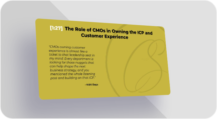 [1:27] The Role of CMOs in Owning the ICP and Customer Experience "CMOs owning customer experience is almost like a ticket to that leadership seat in my mind. Every department is looking for those nuggets that can help shape the next business strategy, and you mentioned the whole listening post and building on that ICP.= – Nidhi Daga