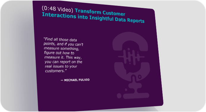 (0:48 Video) Transform Customer Interactions into Insightful Data Reports “Find all those data points, and if you can’t measure something, figure out how to measure it. This way, you can report on the real issues to your customers.” —MICHAEL FULVIO