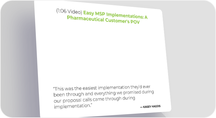 (1:06 Video) Easy MSP Implementations: A Pharmaceutical Customer's POV “This was the easiest implementation they’d ever been through and everything we promised during our proposal calls came through during implementation.” —KASEY HADJIS
