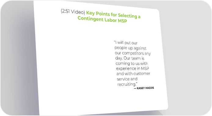 (2:51 Video) Key Points for Selecting a Contingent Labor MSP “I will put our people up against our competitors any day. Our team is coming to us with experience in MSP and with customer service and recruiting.” —KASEY HADJIS