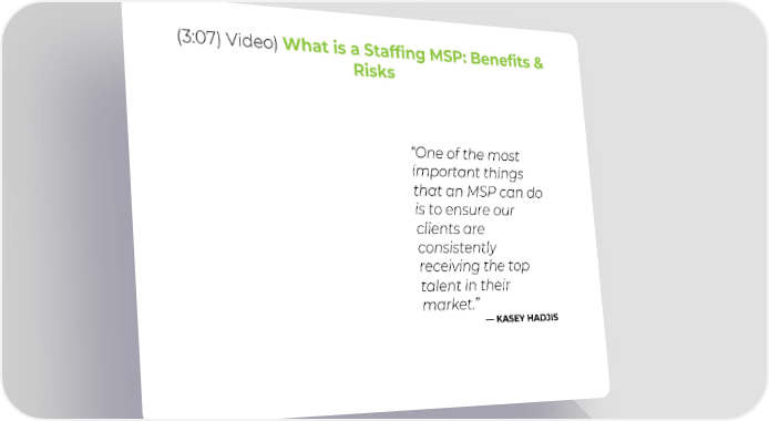 (3:07) Video) What is a Staffing MSP: Benefits & Risks “One of the most important things that an MSP can do is to ensure our clients are consistently receiving the top talent in their market.” —KASEY HADJIS