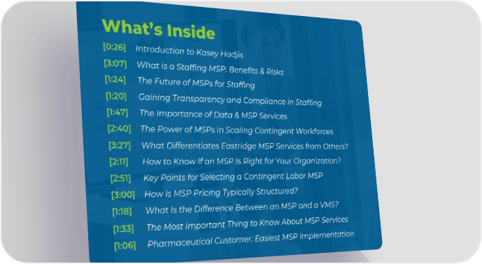 What’s Inside [0:26] Introduction to Kasey Hadjis [3:07] What is a Staffing MSP: Benefits & Risks [1:24] The Future of MSPs for Staffing [1:20] Gaining Transparency and Compliance in Staffing [1:47] The Importance of Data & MSP Services [2:40] The Power of MSPs in Scaling Contingent Workforces [3:27] What Differentiates Eastridge MSP Services from Others? [2:11] How to Know If an MSP Is Right for Your Organization? [2:51] Key Points for Selecting a Contingent Labor MSP [3:00] How Is MSP Pricing Typically Structured? [1:18] What Is the Difference Between an MSP and a VMS? [1:33] The Most Important Thing to Know About MSP Services [1:06] Pharmaceutical Customer: Easiest MSP Implementation