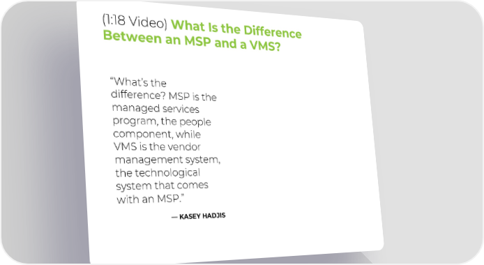 (1:18 Video) What Is the Difference Between an MSP and a VMS? “What’s the difference? MSP is the managed services program, the people component, while VMS is the vendor management system, the technological system that comes with an MSP.” —KASEY HADJIS