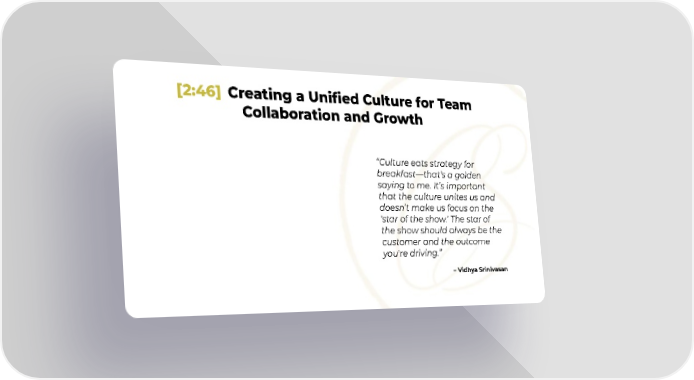 [2:46] Creating a Unified Culture for Team Collaboration and Growth “Culture eats strategy for breakfast—that’s a golden saying to me. It’s important that the culture unites us and doesn’t make us focus on the 'star of the show.' The star of the show should always be the customer and the outcome you're driving.” – Vidhya Srinivasan
