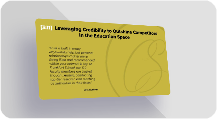 [3:11] Leveraging Credibility to Outshine Competitors in the Education Space "Trust is built in many ways—stats help, but personal relationships matter more. Being liked and recommended within your network is key. At Frankfurt School, our 100 faculty members are trusted thought leaders, conducting top-tier research and teaching as authorities in their fields." – Vera Huebner