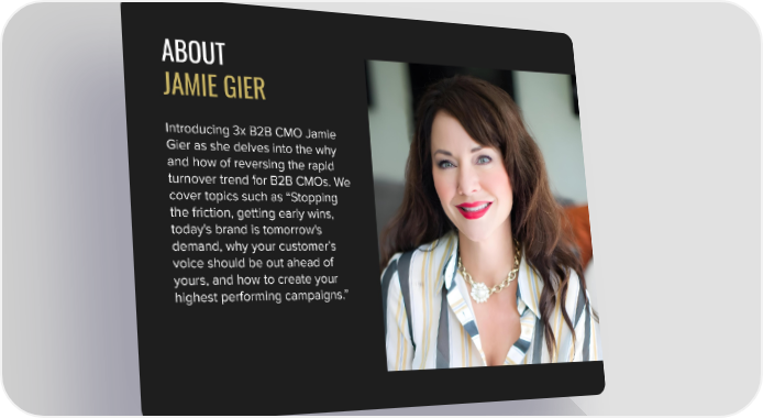 ABOUT JAMIE GIER Introducing 3x B2B CMO Jamie Gier as she delves into the why and how of reversing the rapid turnover trend for B2B CMOs. We cover topics such as “Stopping the friction, getting early wins, today's brand is tomorrow's demand, why your customer’s voice should be out ahead of yours, and how to create your highest performing campaigns.”