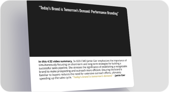 “Today’s Brand is Tomorrow's Demand: Performance Branding” In this 4:32 video summary, 3x B2B CMO Jamie Gier emphasizes the importance of simultaneously focusing on short-term and long-term strategies for building a successful sales pipeline. She stresses the significance of establishing a recognizable brand to make prospecting and outreach more efficient. Ensuring the brand is familiar to buyers reduces the need for extensive outreach efforts, ultimately speeding up the sales cycle. “Today’s brand is tomorrow’s demand.” - Jamie Gier