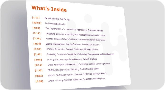 What’s Inside [1:17] Introduction to Pat Ferdig [30:03] Full Podcast Episode [4:53] The Importance of a Humanistic Approach in Customer Service [3:12] Unlocking Success: Assessing and Readapting Business Processes [2:18] Agent’s Essential Contribution to Enhanced Customer Experience [4:04] Agent Enablement: Key to Customer Satisfaction Success [4:59] Shifting Dynamics: Contact Centers as Strategic Assets [2:47] Fostering Customer-Centricity: Embracing Transparency and Collaboration [2:15] Driving Success: Agents as Business Growth Engines [2:11] Cross-Functional Collaboration: Enhancing Contact Center Dynamics [1:33] Shifting the Narrative: Elevating Contact Center Value [0:52] Short - Shifting Dynamics: Contact Centers as Strategic Assets [0:58] Short - Driving Success: Agents as Business Growth Engines