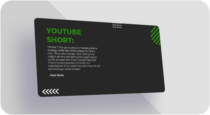 14 YOUTUBE SHORT: “Where CTOs get to play is in helping define strategy while also looking beyond what’s next. They take a longer view, asking how today’s actions are setting the organization up for success tomorrow. Sometimes, that means raising questions to both the organization and customers who may not yet be thinking that far ahead.” - Paul Davis