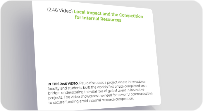 (2:46 Video) Local Impact and the Competition for Internal Resources IN THIS 2:46 VIDEO, Paulo discusses a project where international faculty and students built the world's first offsite-completed arch bridge, underscoring the vital role of global talent in innovative projects. The video showcases the need for powerful communication to secure funding amid internal resource competition.