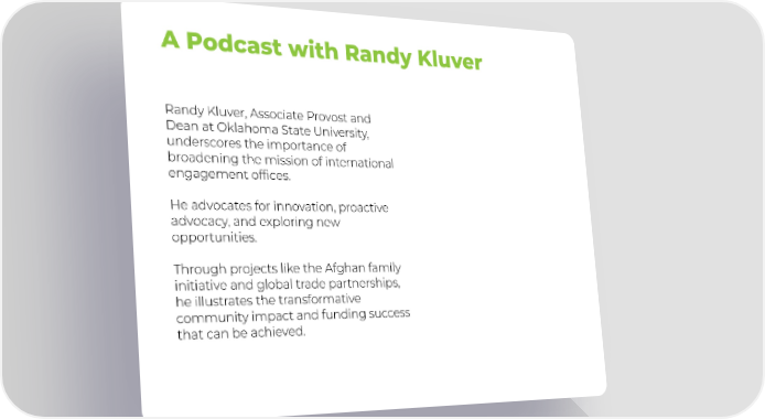 A Podcast with Randy Kluver Randy Kluver, Associate Provost and Dean at Oklahoma State University, underscores the importance of broadening the mission of international engagement offices. He advocates for innovation, proactive advocacy, and exploring new opportunities. Through projects like the Afghan family initiative and global trade partnerships, he illustrates the transformative community impact and funding success that can be achieved.