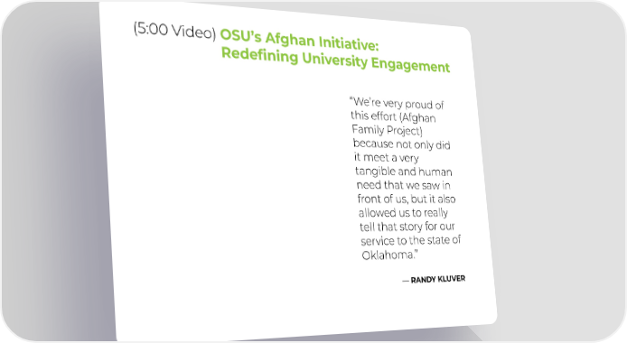 (5:00 Video) OSU’s Afghan Initiative: Redefining University Engagement “We’re very proud of this effort (Afghan Family Project) because not only did it meet a very tangible and human need that we saw in front of us, but it also allowed us to really tell that story for our service to the state of Oklahoma.” — RANDY KLUVER