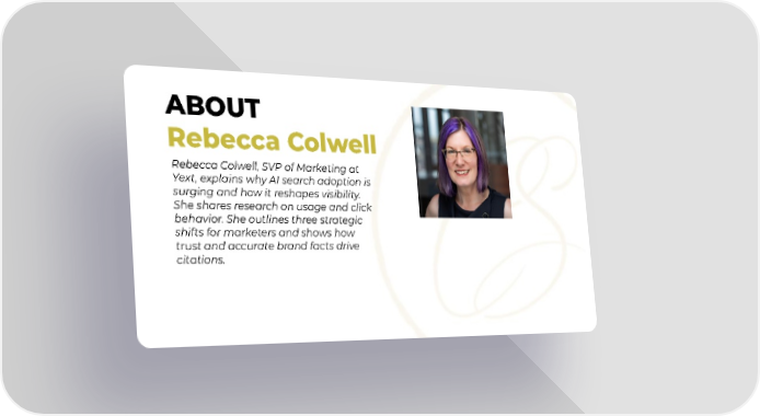 ABOUT Rebecca Colwell Rebecca Colwell, SVP of Marketing at Yext, explains why AI search adoption is surging and how it reshapes visibility. She shares research on usage and click behavior. She outlines three strategic shifts for marketers and shows how trust and accurate brand facts drive citations.