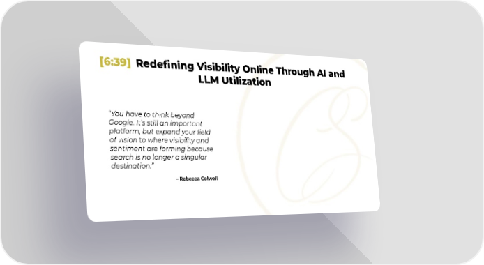 [6:39] Redefining Visibility Online Through AI and LLM Utilization “You have to think beyond Google. It’s still an important platform, but expand your field of vision to where visibility and sentiment are forming because search is no longer a singular destination.” – Rebecca Colwell