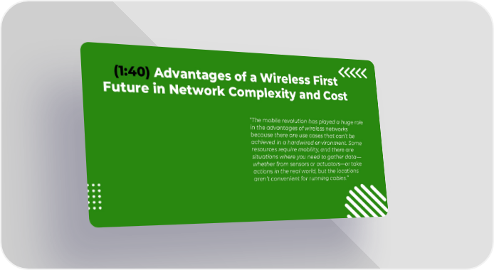 “The mobile revolution has played a huge role in the advantages of wireless networks because there are use cases that can’t be achieved in a hardwired environment. Some resources require mobility, and there are situations where you need to gather data— whether from sensors or actuators—or take actions in the real world, but the locations aren’t convenient for running cables.” (1:40) Advantages of a Wireless First Future in Network Complexity and Cost