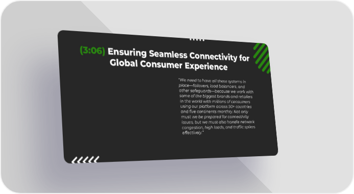 8 (3:06) Ensuring Seamless Connectivity for Global Consumer Experience “We need to have all these systems in place—failovers, load balancers, and other safeguards—because we work with some of the biggest brands and retailers in the world with millions of consumers using our platform across 50+ countries and five continents monthly. Not only must we be prepared for connectivity issues, but we must also handle network congestion, high loads, and traffic spikes effectively.”